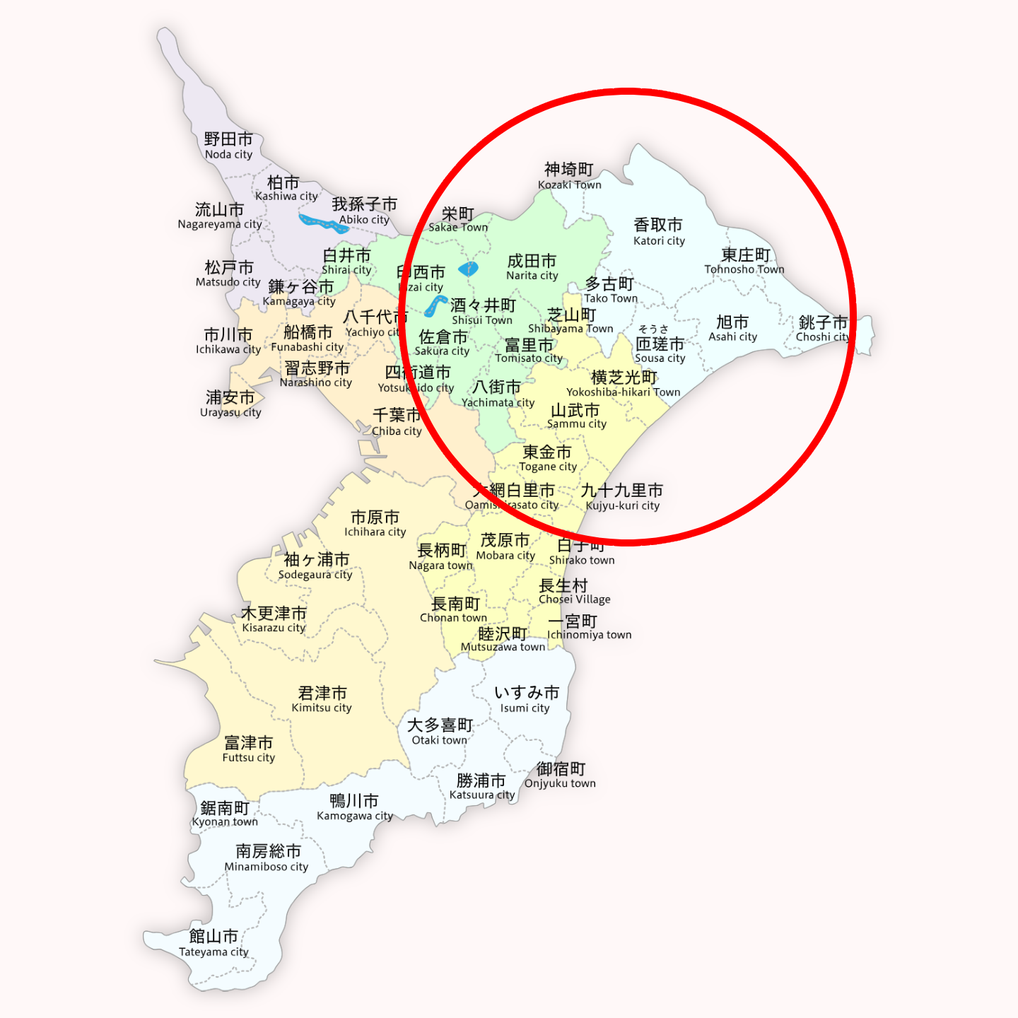 成田市、印西市、佐倉市、酒々井町、栄町、八街市、富里市、神崎町、香取市、多古町、芝山町、東庄町、銚子市、旭市、匝瑳市、横芝光町、山武市、東金市、九十九里町、大網白里市 ※白子町、長生村、一宮町も対応いたします。